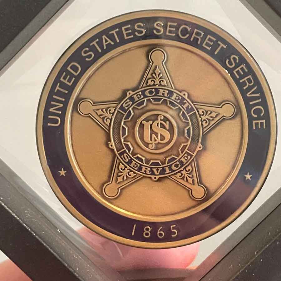 (Below) Framed U.S. Secret Service challenge coin awarded to Peter, honoring his role and dependable service while supporting campaign events and official operations.